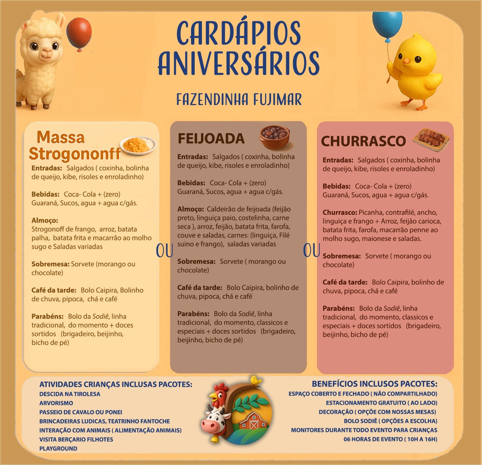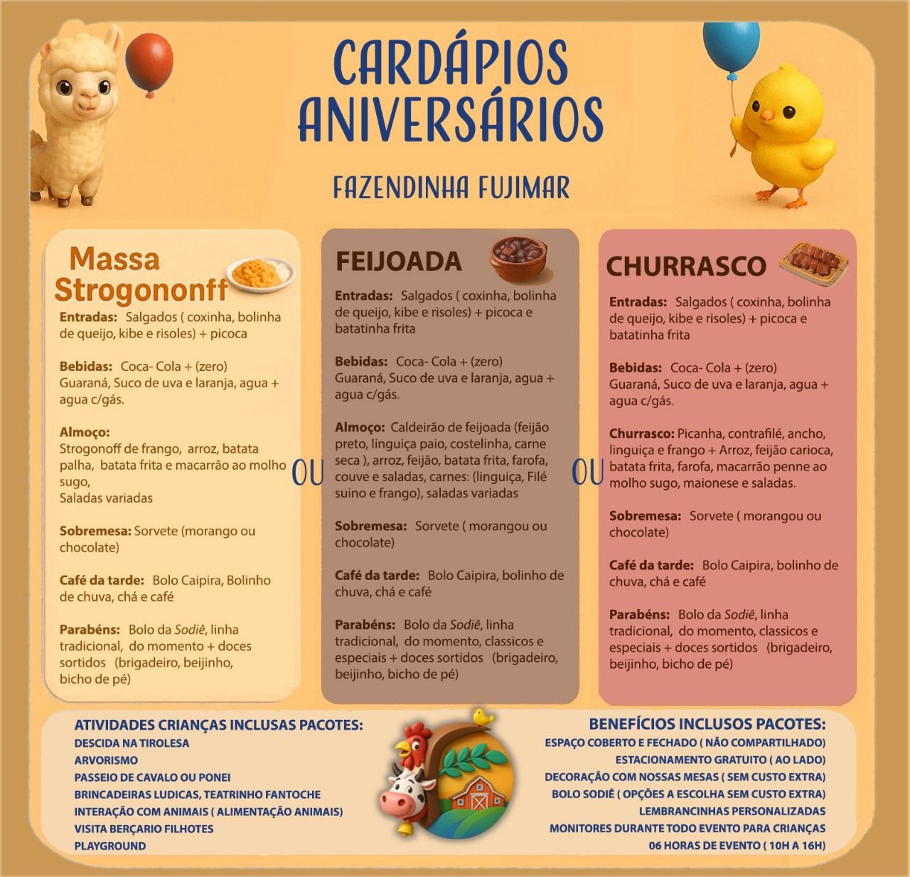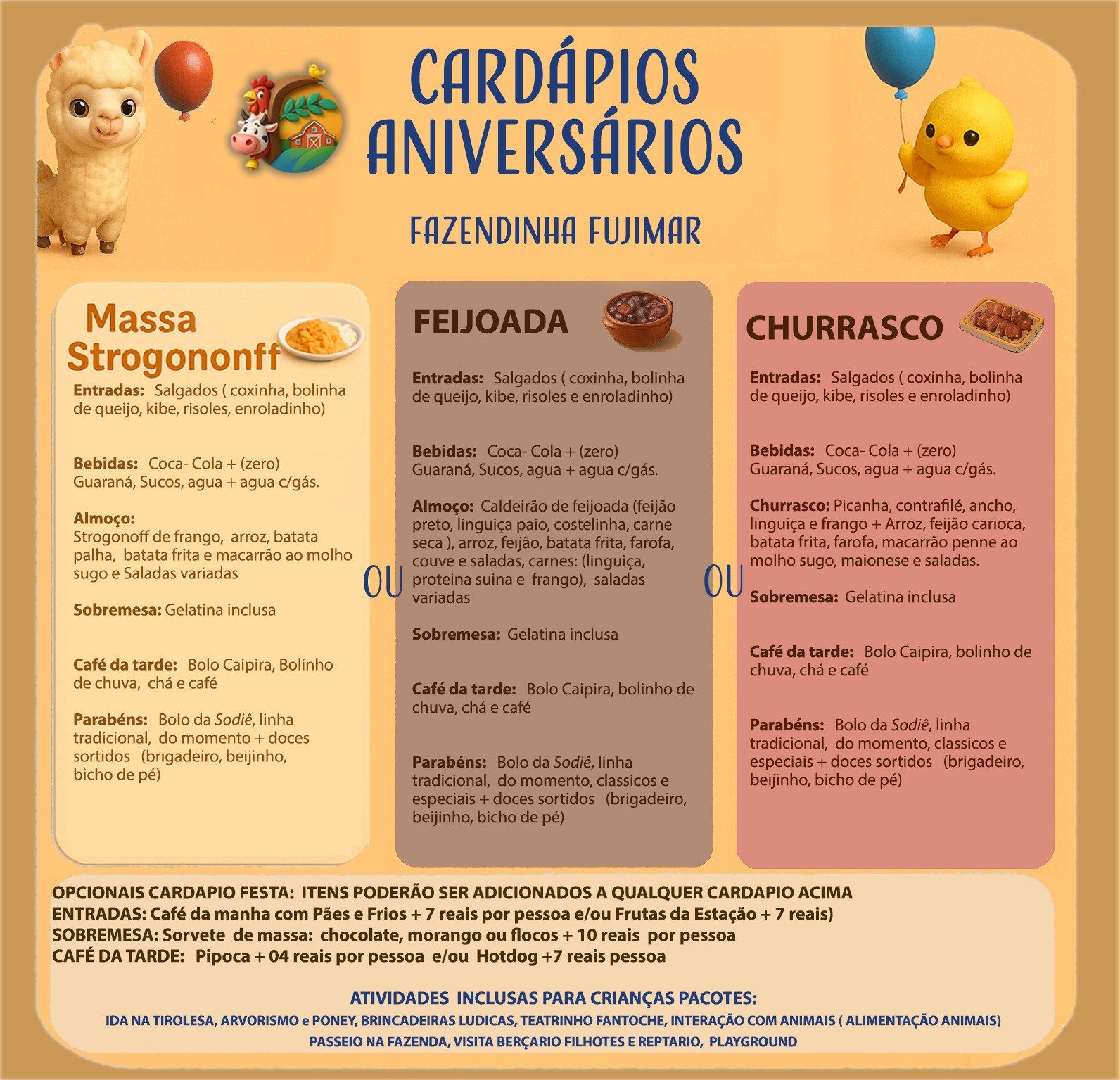 Adicione um toque de encanto e nostalgia à festa de aniversário com o nosso Passeio de Charrete. Este passeio oferece uma maneira divertida e relaxante de explorar a bela fazendinha, permitindo que as crianças e os adultos apreciem a paisagem em um ritmo tranquilo.